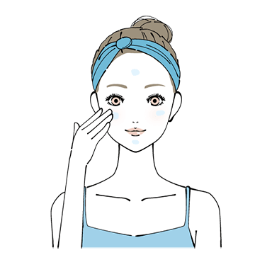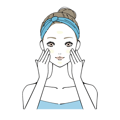 パール粒大の量のクリームを額、両頬に4~5箇所程度置いてから指先を使ってやさしくお顔全体へのばします。- 顔の中心から外側へ